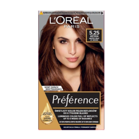 ЛОРЕАЛ БОЯ ЗА КОСА ПРЕФЕРЕНС 5.25 е висококачествена боя за коса в кестеняв нюанс с изключително устойчиви оцветители. Продуктът съдържа патентована система срещу избледняване. Цветът е наситен и сияен от корените до върховете до цели 6 седмици. Балсамът в комплекта придава на косата блясък от първия ден на боядисването и я прави копринено мека. Формулата с UV филтър и витамин Е предпазва от агресивните външни фактори и защитава цвета от силните слънчеви лъчи. Използван веднъж седмично, в продължение на 6 седмици, балсамът поддържа косата красива, жива и сияйна - чак до следващото боядисване. Подходяща за всеки тип коса. С амоняк.