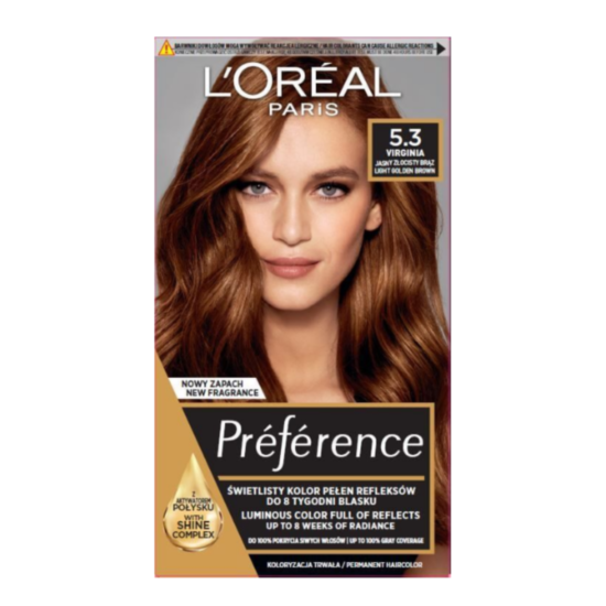 ЛОРЕАЛ БОЯ ЗА КОСА ПРЕФЕРЕНС 5.3 е висококачествена боя за коса в кестеняв нюанс с изключително устойчиви оцветители. Прониква до сърцевината на косъма и осигурява перфектно покритие - дори при бели коси. Продуктът съдържа патентована система срещу избледняване. Цветът е наситен и сияен от корените до върховете до цели 6 седмици. Балсамът в комплекта придава на косата блясък от първия ден на боядисването и я прави копринено мека. Формулата с UV филтър и витамин Е предпазва от агресивните външни фактори и защитава цвета от силните слънчеви лъчи. Използван веднъж седмично, в продължение на 6 седмици, балсамът поддържа косата красива, жива и сияйна - чак до следващото боядисване. Подходяща за всеки тип коса. С амоняк.
