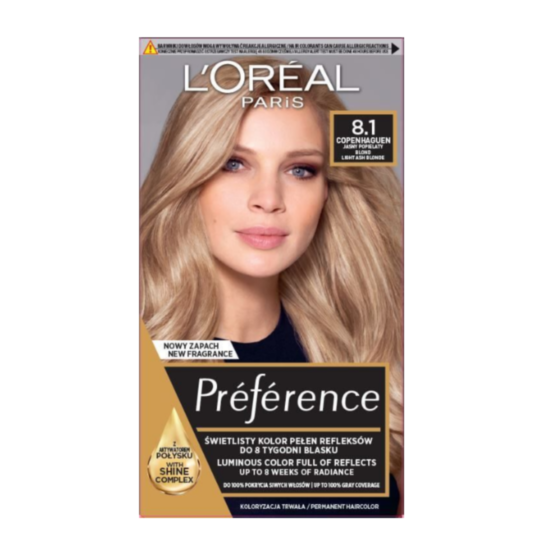 ЛОРЕАЛ БОЯ ЗА КОСА ПРЕФЕРЕНС 8.1 е висококачествена боя за коса в рус нюанс с изключително устойчиви оцветители. Продуктът съдържа патентована система срещу избледняване. Цветът е наситен и сияен от корените до върховете до цели 6 седмици. Балсамът в комплекта придава на косата блясък от първия ден на боядисването и я прави копринено мека. Формулата с UV филтър и витамин Е предпазва от агресивните външни фактори и защитава цвета от силните слънчеви лъчи. Използван веднъж седмично, в продължение на 6 седмици, балсамът поддържа косата красива, жива и сияйна - чак до следващото боядисване. Подходяща за всеки тип коса. С амоняк.