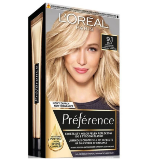 ЛОРЕАЛ БОЯ ЗА КОСА ПРЕФЕРЕНС 9.1 е висококачествена боя за коса в рус нюанс с изключително устойчиви оцветители. Лореал Преферънс 9.1 прониква до сърцевината на косъма и осигурява перфектно покритие - дори при бели коси. Продуктът съдържа патентована система срещу избледняване. Цветът е наситен и сияен от корените до върховете до цели 6 седмици. Балсамът в комплекта придава на косата блясък от първия ден на боядисването и я прави копринено мека. Формулата с UV филтър и витамин Е предпазва от агресивните външни фактори и защитава цвета от силните слънчеви лъчи. Използван веднъж седмично, в продължение на 6 седмици, балсамът поддържа косата красива, жива и сияйна - чак до следващото боядисване. Подходяща за всеки тип коса. С амоняк.
