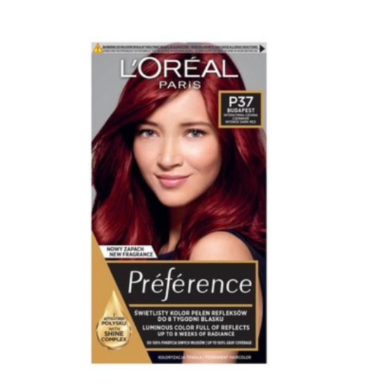 ЛОРЕАЛ БОЯ ЗА КОСА ПРЕФЕРЕНС Р37  - Интензивен червен цвят и въздействащи отблясъци, Лореал Преференс с оцветители отразяващи светлината, които проникват до сърцевината на косъма и осигуряват оптимално покритие. С включен Color Lock балсам за допълнителна грижа след нанасяне, съдържа UV филтър и витамин E, който защитава от вредните влияния на околната среда и оставя усещане за копринена мекота.