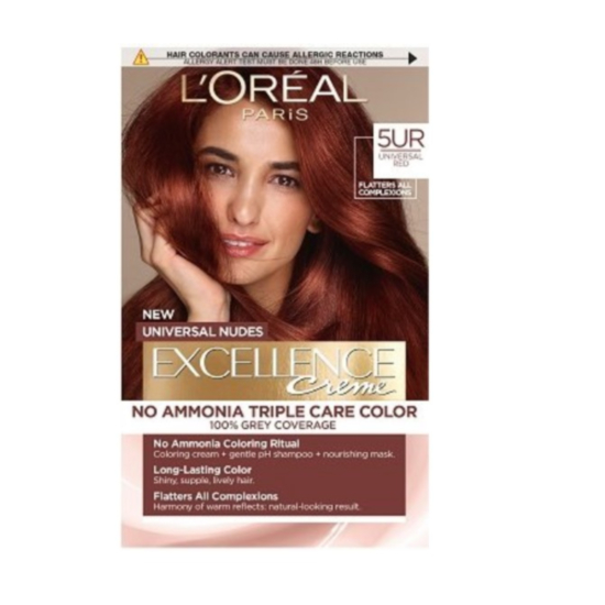 ЛОРЕАЛ БОЯ ЗА КОСА ЕКСЕЛЕНС 5UR е иновативна безамонячна боя Excellence Creme Triple, създадена съвместно с професионални колористи. Тя има приятен аромат и се предлага в естествени цветове с универсален отблясък, които прилягат на всеки тон на кожата. Боята осигурява тристепенна грижа за цялостен ритуал за красива коса. В комплекта са включени специален шампоан с нежно pH и маска, която подхранва косъма след боядисването.