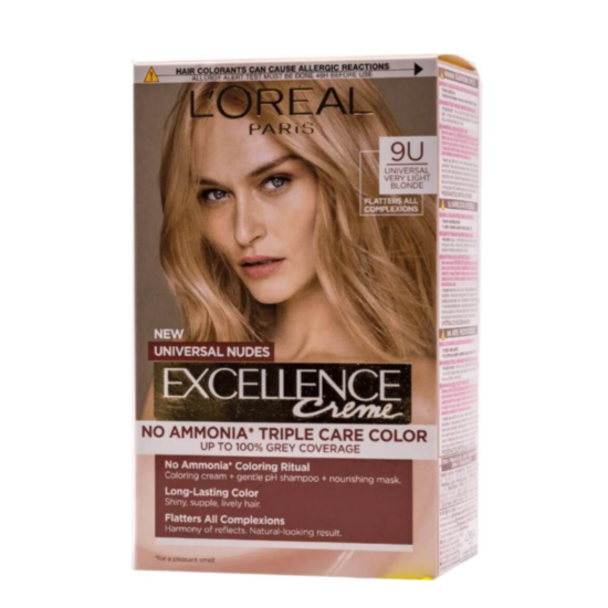 ЛОРЕАЛ БОЯ ЗА КОСА ЕКСЕЛЕНС 9U представлява дълготрайна боя за коса с нов крем оцветител без амоняк. Цялата интензивност на боята за коса е във формула без амоняк, обогатена със защитни агенти. Продуктът покрива сивите и белите коси до съвършенство. Има нов универсален отблясък U - уникална комбинация от студени и топли отблясъци за резултат, който придава естествен вид на цвета и е подходящ за всеки тен. Също така съдържа защитни агенти, предпазващи косъма. За всеки тип коса. Дерматологично тестван продукт.