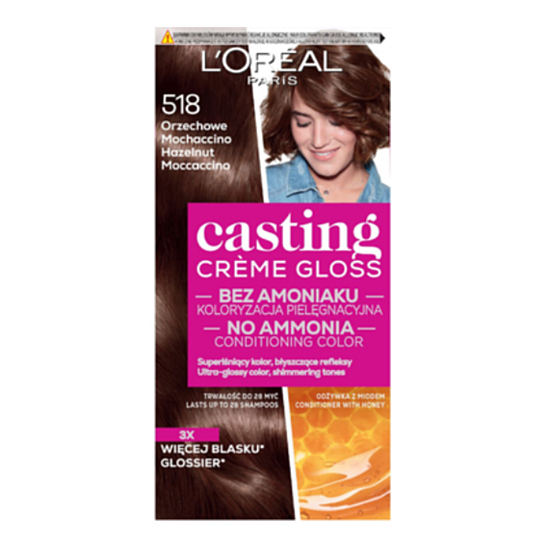 ЛОРЕАЛ БОЯ ЗА КОСА КАСТИНГ КРЕМ ГЛОС 518 представлява боя за коса без амоняк, която осигурява покритие на белите коси с интензивен цвят. Боята притежава подхранващ комплекс, който поддържа косата защитена и подхранена, а формулата е обогатена с пчелно млечице, което прави косата мека, гладка и с блясък. Боята е с приятен аромат, като в същото време възстановява и освежава изцяло косъма.