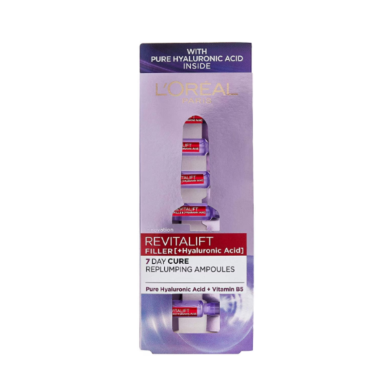 ЛОРЕАЛ ДЕРМО РЕВИТАЛИФТ ФИЛЪР АМПУЛИ ЗА ЛИЦЕ 7БР Х 1МЛ - Подмладяващи ампули за лице, които са специално разработени за борбата със стареенето и са обогатени с хиалуронова киселина. Разработената формула осигурява интензивна седемдневна терапия, която подобрява еластичността и плътността на кожата, подпомага обновяването на клетките, изглажда образувалите се фини бръчки и стяга лицето. Съдържащата се концентрирана чиста хиалуронова киселина е известна с мощните си хидратиращи свойства и подмладяващ ефект и благодарение на нея, кожата е усещане за комфорт, свежест и възстановен младежки поглед. Деликатната текстура на ампулите е лесна за нанасяне и може да се прилага върху скулите, бузите, челюстта, около устните, между веждите и по контурите на лицето.