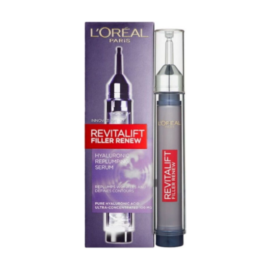 ЛОРЕАЛ ДЕРМО РЕВИТАЛИФТ ФИЛЪР СЕРУМ ЗА ЛИЦЕ 18МЛ е серум за лице с хиалуронова киселина, който осигурява ефективна грижа и възобновява обема на кожата на лицето. Специалната му формула е обогатена с концентрирана чиста хиалуронова киселина и глицерин, известни с мощното действие против бръчки, помагат на кожата да поддържа своята еластичност, като и придават допълнителна гладкост и мекота. След редовната употреба на серума за лице, кожата ви ще бъде мека, сияйна и с естествен младежки вид.