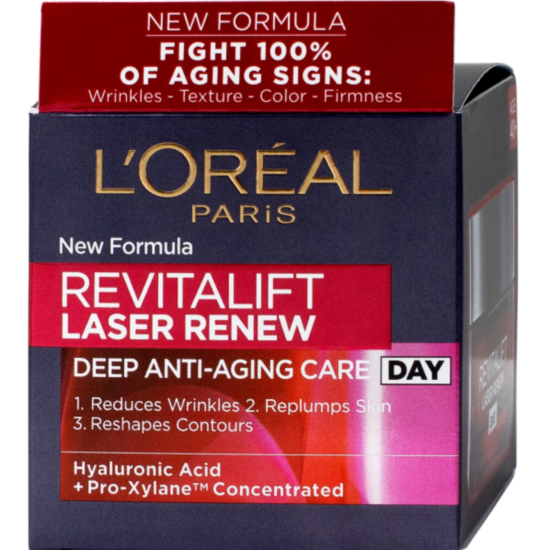 ЛОРЕАЛ ДЕРМО РЕВИТАЛИФТ ЛАЗЕР ДНЕВЕН КРЕМ ЗА ЛИЦЕ 50МЛ - Дневен крем за лице против бръчки и стареене на кожата с ефект "лазерна терапия". Мощната му формула съдържа активните съставки - 3% Pro-Xylane, фрагментирана хиалуронова киселина, които хидратират, изглаждат, уплътняват и оформят кожата на лицето. Кремът на Лореал изглажда съществуващите бръчки и намалява появата на нови бръчки, като подобрява плътността и еластичността на кожата. След употреба на крема кожата е мека, еластична и хидратирана, а признаците на стареене и бръчки елиминирани.