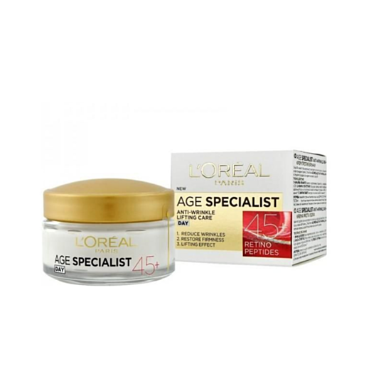 ЛОРЕАЛ ЕЙДЖ СПЕЦИАЛИСТ 45+ ДНЕВЕН КРЕМ 50МЛ - След 45 години се появяват все повече фини линии и видими бръчки. L'Oréal Age Specialist 45+ е крем със специална формула против бръчки, която поддържа кожата в младежки вид на всяка възраст. В състава му има проретинол, който подсилва еластичността на кожата и нейното регенериране, и масло от камелия, което е изключително благородно и подхранва и хидратира кожата.