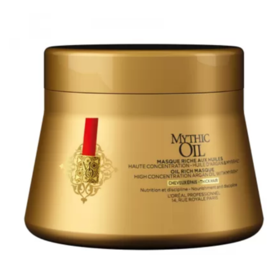 ЛОРЕАЛ ПРОФ. МИТИЧНО ОЛИО МАСКА ЗА ПЛЪТНА КОСА 200 МЛ е маска за коса, която дава на плътната коса мекота, блясък и укротяване. Тя възстановява и подхранва непокорната коса. Формулата е обогатена с масло от арган, обогатено с витамин Е. Добавен е и екстракт от смирна, известен с ревитализиращите си свойства. Маслото от арган подхранва в дълбочина и оставя косата мека и блестяща, а екстрактът от смирна има силно възстановяващо действие. Маската улеснява разресването и оформянето на прическата, като придава на косата копринена мекота. След употреба косата е мека, жизнена и подхранена.