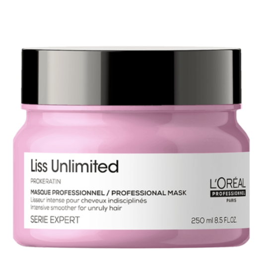 ЛОРЕАЛ ПРОФЕШЪНЪЛ LISS UNLIMITED МАСКА ЗА КОСА 250МЛ е маска създадена по нова формула, обогатена с Pro-Keratin и масла от кукуи и вечерна иглика. Осигурява изглаждащ и анти-заплитащ ефект, като добавя блясък и мекота. Възстановява и подхранва непокорната и бухнала коса. Перфектно овлажнява косата, заглажда я и укротява, като добавя красив блясък.
