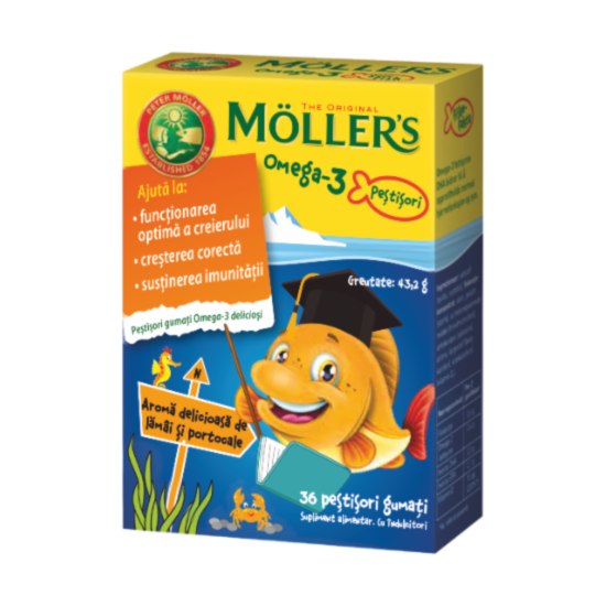 МЬОЛЕРС ОМЕГА 3 ЖЕЛИРАНИ РИБКИ ПОРТОКАЛ осигурява необходимата дневна доза Omega-3 и витамин D. Приятен лимонов и портокалов вкус. Без изкуствени оцветители. Децата го обожават!