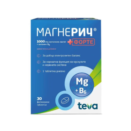 Магнерич Форте е хранителна добавка, която подкрепя нормалната функция на мускулите, допринася за намаляване на умората и изтощението, балансира енергийният метаболизъм. Магнерич Форте спомага за добра работа на нервната система и психичните функции.