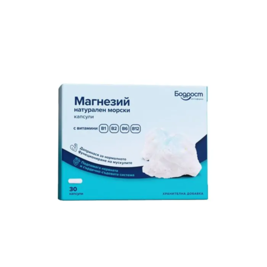 Магнезий натурален морски Бодрост е хранителна добавка, която съдържа натурален магнезий от морска вода с отлична усвояемост в организма. Магнезий натурален морски Бодрост е обогатен с 4 витамина от групата B и има благоприятно въздействие върху нервната система и психичните функции. Приемът му подобрява мускулния тонус и облекчава