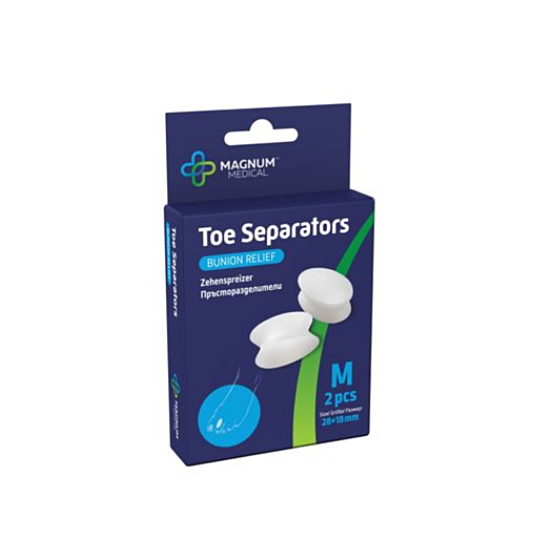 МАГНУМ МЕДИКАЛ ПРЪСТОРАЗДЕЛИТЕЛ РАЗМЕР М 2X18MM - пръсторазделителите облекчават болката, предизвикана от кокалчето на палеца и припокриващите се пръсти на краката, чрез поддържането на правилната позиция на палеца. Те намаляват триенето и предпазват от мехури и мазоли. Гъвкавият топлоустойчив материал приляга на пръстите на краката Ви и пасва удобно във всеки тип обувка, позволявайки носене през целия ден без изпотяване. Пръсторазделителите могат да се носят и през нощта под чорапите Ви за 24-часова корекция и облекчаване на напрежението.
