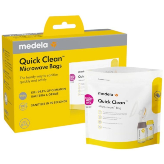 Уникалните, многократни пликчета за стерилизиране в микровълнова фурна Medela - Quick Clean елиминират 99.9% от всички вредни бактерии и микроби от повечето части на помпата за кърма и аксесоарите за хранене. Можете да извършвате ежедневната стерилизация за 3 минути благодарение на тези лесни за употреба пликчета с микро пара. По-бързо от преваряването и по-ефективни от измиването, тези пликчета спестяват реално време за майките. Просто добавете вода и сложете в микровълновата фурна. Всяко пликче може да се използва до 20 пъти.