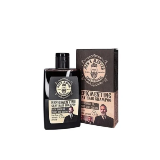 Мен Мастър Репигментиращ шампоан за побеляла коса 260мл е репигментиращ шампоан за мъже, който добавя постепенно цвят на побелялата коса с всяко нанасяне. Придава и естествен сив оттенък. Добавеното във формулата масло от баобаб придава блясък и спомага за по-лесното разресване и оформяне на косата. Съставът му е без амоняк и оксидант и щади косата.