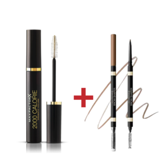 МАКС ФАКТОР КОМПЛЕКТ СПИРАЛА 2000 КАЛОРИИ ЧЕРНO KAФЯВА 9МЛ + МОЛИВ ЗА ВЕЖДИ БРАУН ШЕЙПЪР 10 /25563+74808/