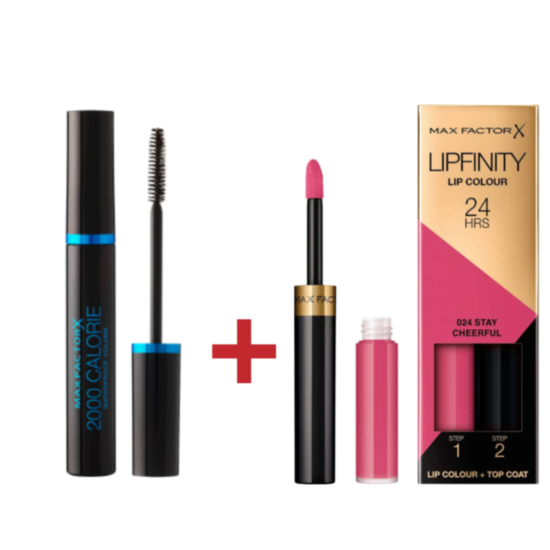 МАКС ФАКТОР КОМПЛЕКТ СПИРАЛА 2000 КАЛОРИИ ВОДОУСТОЙЧИВА 9МЛ + ДЪЛГОТРАЙНО ЧЕРВИЛО ЛИПФИНИТИ 024 /53343+76657/