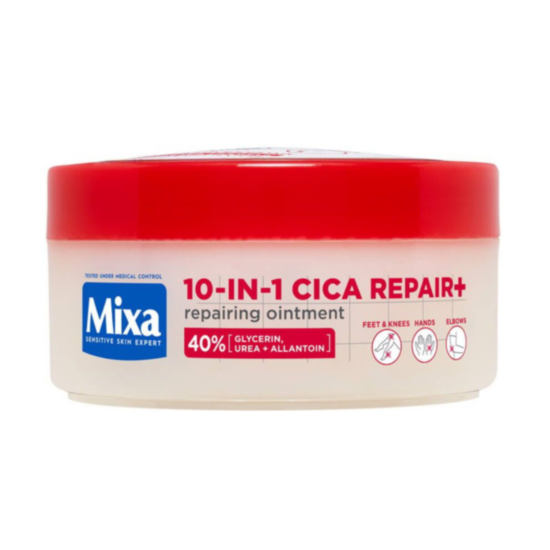 MIXA 10 in 1 CICA REPAIR+ Микса Цика Репеър 10 в 1 Ултра възстановяващ мехлем за много суха, напукана и загрубяла кожа. Високо концентрирана формула обогатена с 40% глицерин, урея и алантоин. Интензивно хидратира, омекотява и изглажда сухата и напукана кожа на ръцете, лактите, коленете и стъпалата. Подсилва защитната функция на кожната бариера, успокоява и премахва усещането за сухота, опънатост и дискомфорт. Подобрява еластичността и намалява загрубелите участъци и мазолите. Може да се използва и като възстановяваща нощна маска. Лека текстура която се абсорбира бързо и не оставя мазно и лепкаво усещане.