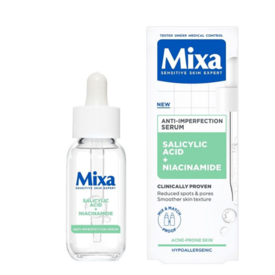 МИКСА ХИДРАТИРАЩ СЕРУМ ПРОТИВ НЕСЪВЪРШЕНСТВА 30МЛ - Серумът е специално разработен за чувствителната кожа, склонна към несъвършенства. Той редуцира появата на петна и черни точки. Освен това свива порите и изглажда текстурата на кожата. Формулата на серума Mixa е обогатена със салицилова киселина, която нежно ексфолира. Тя стимулира регенерация на кожата и намалява излишния себум. Освен това притежава почистващи, антибактериални и противовъзпалителни свойства. Добавен е и ниацинамид (витамин B3), който действа изглаждащо, подмладяващо и стягащо. Той помага за намаляване на пигментни петна и за изравняване на тена на кожата.