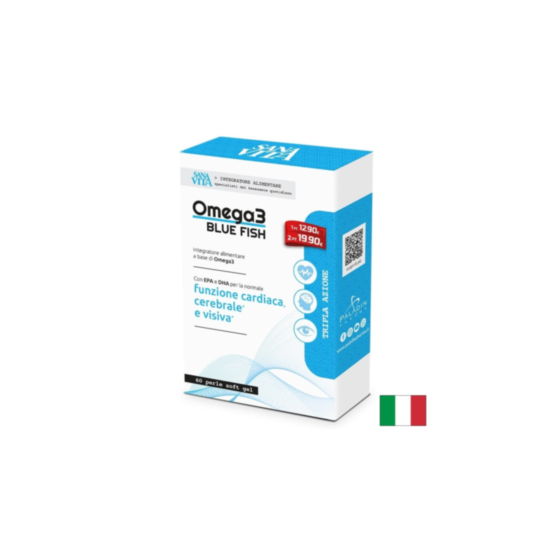 Sanavita Omega3 Blue Fish - Омега-3 Рибено масло 500 mg (EPA 175 mg/ DHA/ 125 mg) е хранителна добавка, която съдържа в състава си екстракт от рибено масло, EPA (ейкозапентаенова киселина) и DHA (докозахексаенова киселина). Допринася за нормалното функциониране на сърдечно-съдовата система и спомага за намаляване риска от развитие на сърдечни заболявания. Подобрява здравето на артериите, намалява риска от образуване на кръвни съсиреци, допринася за намаляване нивата на лошия холестерол и контролира кръвното налягане. Тази хранителна добавка поддържа мозъчната функция, подкрепя нормалното функциониране на нервната система и допринася за подобряване на когнитивното здраве, паметта и концентрацията. Освен това се грижи за здравето на очите и доброто зрение и помага в борбата с оксидативния стрес и свободните радикали, които са отговорни за клетъчното стареене.