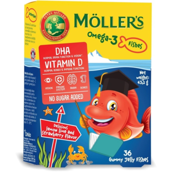 DHA е един от основните компоненти на мозъка, с голямо влияние върху оптималното функциониране, клинично документирано. Möller's Omega-3 желирани рибки съдържа висока концентрация DHA, което допринася за нормалното развитие на мозъка и зрението. Витамин D допринася за нормалното усвояване на калция и фосфора и за поддържането на здравето на костите.