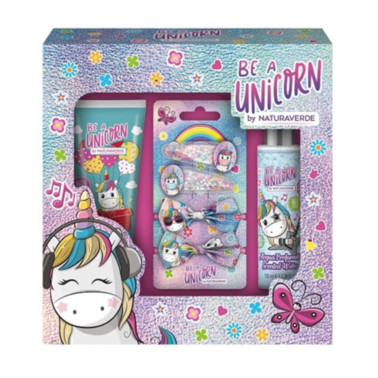Зарадвайте малките почитателки на еднорозите с подаръчния комплект Be a Unicorn. Той включва пяна за вана, парфюмна вода и аксесоари за коса. Дизайнът на продуктите е с илюстрации на забавни еднорози.