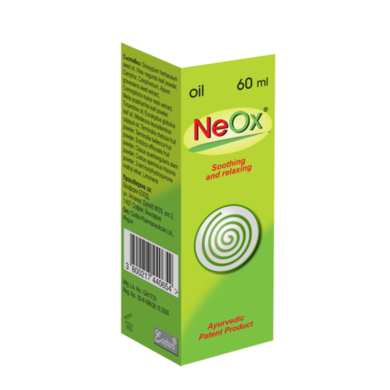 Ne®Ox oil съдържа автентични билки и есенциални масла като Commiphora mukul (Guggul), Vitex negundo (Nirgundi), Cissus quadrangularis (Asthisamhara), Costus Speciosus (Bramhatirth), Melia azadirachta (Neem), Pinus longifolia (Gandhibarejo), Apium graveolens extract (Ajmoda), Cedrus deodara (Devdar), Eucalyptus oil (Nilgiri) и Melaleuca leucadendron (Cajuput oil), които са известни и традиционно широко използвани в Аюрведа;