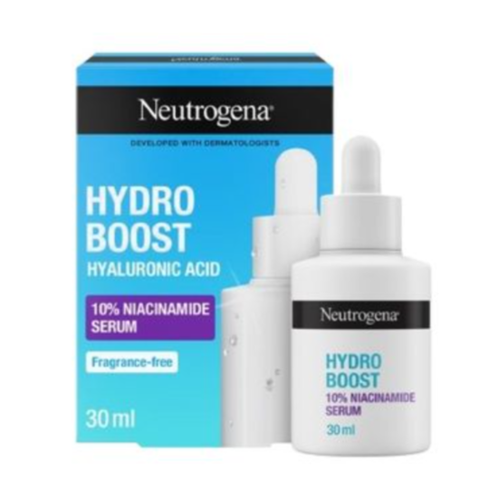 Neutrogena Hydro Boost Серум за лице с 10% ниацинамид е лек, бързоабсорбиращ се серум, формулиран с 10% ниацинамид, който помага за изравняване на тена, намаляване на тъмни петна, зачервявания и други признаци на неравномерен тен. Серумът е подходящ за всеки тип кожа. Oil-free формула. Некомедоногенен. Дерматологично тестван продукт.