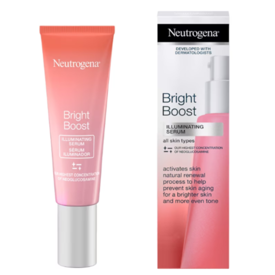 НЕУТРОДЖИНА БРАЙТ БУУСТ ОЗАРЯВАЩ СЕРУМ 30МЛ е озаряващ серум за лице, който незабавно озарява кожата. Подходящ за всеки тип кожа. Помага за предотвратяване на стареенето на кожата, като ускорява обновяването на кожните клетки, за по-сияйна кожа и по-равен тен. Разработен срещу зачервяване, пигментация и уморена кожа, сияйният серум намалява видимите несъвършенства и тъмните петна, за по-чиста кожа. Специалната формула съдържа висока концетрация на неоглюкозамин - некиселинна амино-захар, която активира естествения процес на обновяване на кожата и го ускорява с 10 пъти. Тя научно доказано помага за предотвратяване на хиперпигментация и намаляване появата на тъмни петна. Освен това предотвратява и намалява появата на фини линии и бръчки. При редовна употреба, кожата става по-равномерна и сияйна. С лека тесктура. Без парабени. Дерматологично тестван продукт. Некомедогенен.
