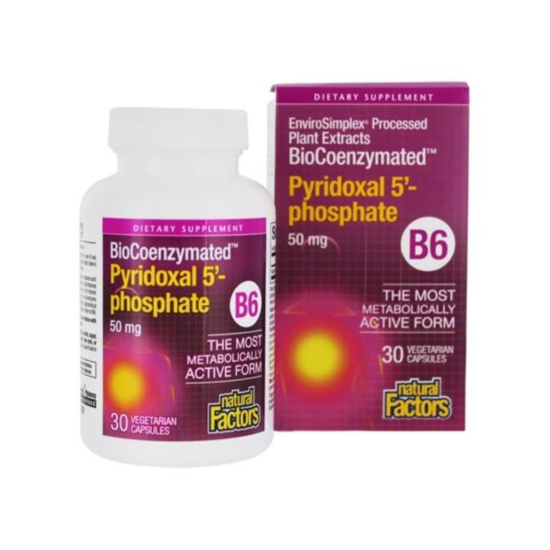 Natural Factors BioCoenzymated Pyridoxal 5’-phosphate е хранителна добавка с Витамин В6 като пиридоксал-5-фосфат за добър метаболизъм. Това е коензимираната, метаболитно активна форма на В6, лесно усвоима от тялото. В продукта витаминът е в комбинация с патентованата, биоактивна смес фитонутриенти Farm Fresh Factors, включваща зеленчуци, плодове, билки, растения и морски видове. Така получената синергична формула доставя на клетките метаболитно активни хранителни вещества. Витамин B6 е част от семейството на витамините В комплекс, имащи важна роля за различни физически и психологични функции. Съставът на BioCoenzymated Pyridoxal 5’-phosphate е тестван и сертифициран от ISURA, гарантиращо липсата в него на ГМО, пестициди, разтворители, тежки метали.