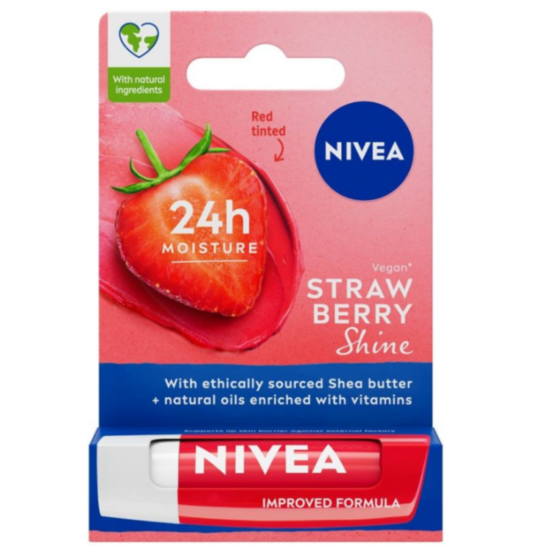 НИВЕА БАЛСАМ ЗА УСТНИ ЯГОДА 4.8гр 85083 - Балсамът за устни Strawberry Shine от Nivea има прекрасен ягодов аромат и деликатен червеникав цвят. Той има уникална формула с натурални масла и блестящи пигменти, която се разтапя по устните и ги запазва хидратирани до 24 часа.