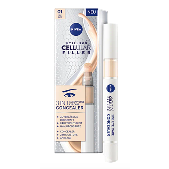 НИВЕА CELLULAR 3in1 ОКОЛООЧЕН КРЕМ ПРОТИВ БРЪЧКИ И КОРЕКТОР СВЕТЪЛ ТОН 4МЛ - Осигурява 24 ч. хидратация на кожата на околоочния контур. Също така видимо намалява бръчките и мимическите линии, благодарение на формулата с хиалурон. Прикрива тъмните кръгове и освежава погледа, благодарение на цветните пигменти във формулата.