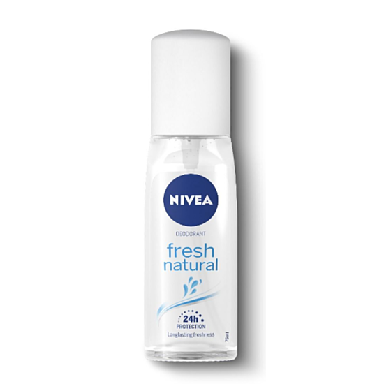Нивеа Дезодорант Спрей-помпа дамски Fresh Natural 75мл е дезодорант против изпотяване, предназначен за ежедневна употреба, който доказано защитава от изпотяване и неприятна миризма. Подходящ за всеки тип кожа. Специалната формула съдържа ценни активни съставки, които подхранват кожата в дълбочина. Употребата на дезодоранта осигурява оптимална защита от изпотяване и деликатно се грижи за вашата кожа, без да я изсушава. Високоефективната формула срещу изпотяване и неприятни миризми, осигурява на подмишниците комфорт, чувство за сухота и кадифена мекота. Дерматологично тестван продукт.