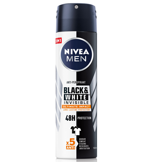 НИВЕА ДЕЗОДОРАНТ СПРЕЙ МЪЖКИ INVISIBLE ON BLACK&WHITE ULTIMATE IMPACT 150МЛ - Спрей дезодорантът Black & White Invisible Ultimate Impact от Нивеа осигурява дълготрайна 5 в 1 защита - без неприятни миризми, изпотяване и дразнене на кожата, както и без петна и остатъци по дрехите. Той предлага 48-часова защита и оставя приятно усещане за сухота и свежест през целия ден. Продуктът е дерматологично тестван и не съдържа етилов алкохол.