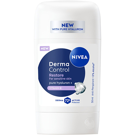 Формулата на стика против изпотяване Nivea Derma Control Restore с чиста хиалуронова киселина и витамин Е ефективно успокоява раздразнената кожа и насърчава възстановяването на кожата след епилация. За по-меки и красиви подмишници и усещане за здрава кожа. Антиперспирантната серия осигурява 72-часова защита. Формулата работи с кожата за надеждна и мощна ефикасност срещу изпотяване и неприятни миризми, като същевременно се грижи за кожата на подмишниците. Не съдържа етилов алкохол и поносимостта към кожата е дерматологично доказана. Продуктът е подходящ за чувствителна кожа. С хипоалергенен аромат. Да не се нанася върху раздразнена или наранена кожа.