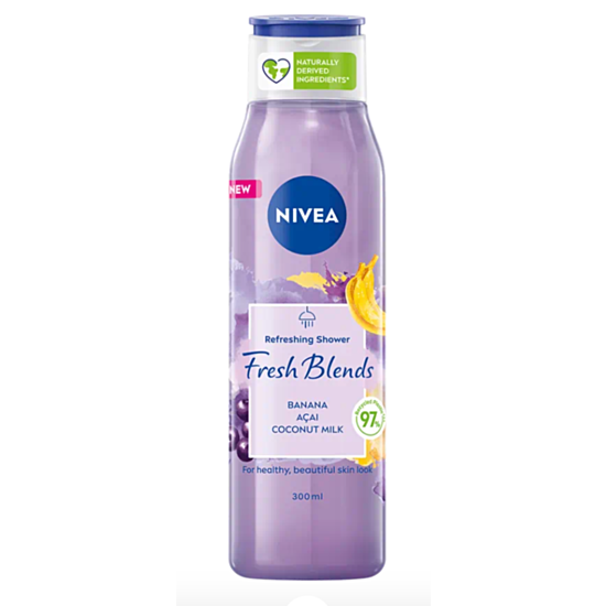 НИВЕА ДУШ ГЕЛ С АКАЙ БЕРИ, БАНАН И КОКОСОВО МЛЯКО 300МЛ - NIVEA Fresh Blends Açai & Banana e oсвежаващ душ гел, който предлага наслада за теб и сетивата ти, с грижа към околната среда. С 97% биоразградима формула, направена от естествено добити съставки, плодов сок, вкусен банан и екзотичен аромат на акай бери в комбинация с кокосово мляко.