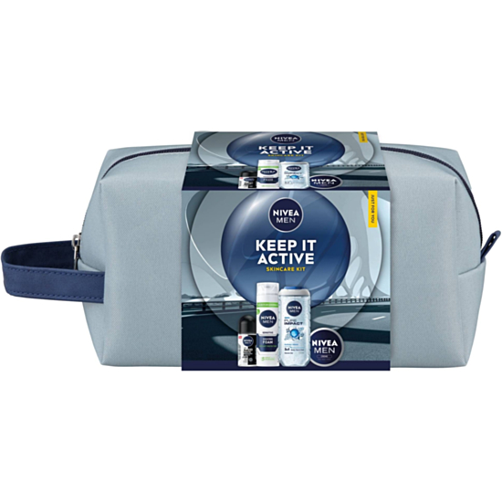 Подаръчният комплект Keep It Active на Nivea включва 4 страхотни продукта, които ще се погрижат за мъжката кожа - рол-он дезодорант Black & White Invisible Original, пяна за бръснене Sensitive, душ гел Pure Impact и универсален крем за тяло. Към тях има и удобен несесер.