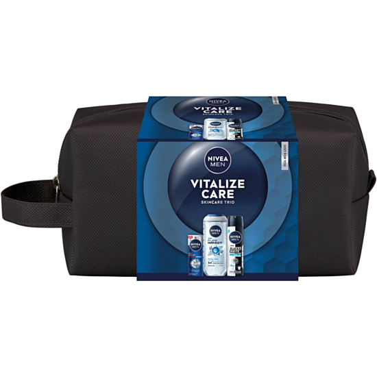 Подаръчният комплект Vitalize Care на Nivea включва 3 страхотни продукта, които ще се погрижат за мъжката кожа - серум срещу пигментни петна и бръчки, душ гел Pure Impact и спрей дезодорант Black & White Invisible Fresh. Към тях има и удобен несесер.