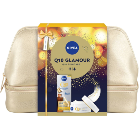 Подаръчният комплект Q10 Glamour на Nivea включва 2 страхотни продукта, които ще се погрижат за здравето и красотата на кожата на лицето - серум с двойно действие Q10 Anti-Wrinkle Expert и дневен крем против бръчки Q10 Anti-Wrinkle Power. Към тях има и удобен несесер.