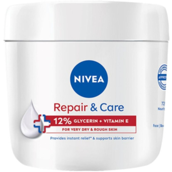 Почувствайте незабавно облекчение на сухата и груба кожа с крема за тяло на Nivea Repair & Care Intensive. Този крем за интензивна грижа осигурява дълготрайна хидратация и подхранване, оставяйки кожата ви мека и гладка. Уникалната му формула създава защитна бариера, която помага да се предотврати по-нататъшната загуба на влага и предпазва от външни фактори. Кремът е обогатен с пантенол и глицерин, известни със своите интензивни хидратиращи и омекотяващи свойства. Насладете се на лечебната сила на Nivea Repair & Care за видимо по-гладка кожа.