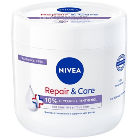 Крема на Nivea Repair & Care за чувствителна кожа. Със своята нежна и без аромат формула, този крем осигурява интензивна грижа за кожата ти, без да я дразни. Неговата подхранваща формула защитава кожната бариера, за да я остави по-здрава и гладка. Подходящ е за всеки тип кожа. Идеален е и за тези със суха и чувствителна кожа, които търсят облекчение. Получи комфорта, от който се нуждаеш, с Nivea Repair & Care за чувствителна кожа.