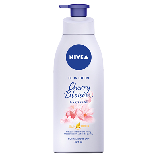 НИВЕА ЛОСИОН ЗА ТЯЛО С ЧЕРЕШОВ ЦВЯТ И МАСЛО ОТ ЖОЖОБА  400МЛ 88441 - Той я хидратира и я дарява с подхранваща грижа. Формулата му е обогатена с масло от жожоба, което успокоява, помага за задържане на влагата в клетките на епидермиса и го предпазва от изсушаване. Нежната текстура на лосиона се абсорбира бързо, без да оставя мазно усещане. Прави кожата еластична и нежна на допир и я обгръща с приятен аромат на черешов цвят, който осигурява дълготрайно чувство за свежест. Съвместимостта на лосиона с кожата е дерматологично доказана. Може да се използва ежедневно както за нормална, така и за суха кожа на тялото.