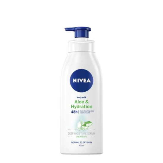 НИВЕА ЛОСИОН ЗА ТЯЛО 5В1 АЛОЕ ВЕРА И ПОДХРАНВАЩ СЕРУМ 400МЛ е лосион за тяло, който осигурява дълбока хидратация на кожата. Обогатен е с интензивен овлажняващ серум и екстракт от алое вера, които успокояват раздразненията и оставят кожата мека и с усещане за комфорт. Грижовната формула осигурява до 48ч. хидратация на кожата, леката флуидна текстура се абсорбира бързо и предпазва кожата от изсушаване. Лосионът е подходящ за ежедневна грижа за всеки тип кожа, особено за суха.