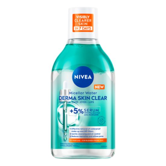 Мицеларната вода NIVEA Derma Skin Clear за кожа, склонна към несъвършенства, е обогатена с 5% серум с PHA, салицилова киселина и ниацинамид. Ефективно премахва водоустойчивия грим, замърсяванията и SPF филтрите само с няколко движения, без да оставя мазни следи. Намалява акнето, свива порите и контролира омазняването - за гладка и чиста кожа. Не е необходимо триене - почиства кожата много нежно. Ефектът против акне е тестван в клинично проучване. Формулата за изглаждане и усъвършенстване на тена не съдържа парфюм и съвместимостта ѝ с кожата и очите е дерматологично и офталмологично одобрена.