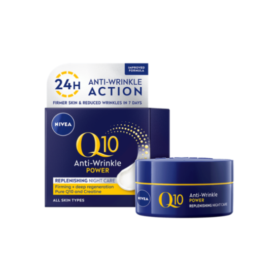 НИВЕА Q10 POWER НОЩЕН КРЕМ ПРОТИВ БРЪЧКИ 50МЛ 81289 е нощен крем за лице, подходящ за всеки тип кожа. Специалната формула е обогатена с Q10 и Креатин, които проникват в дълбочина и стимулират естественото производство на колаген, регенерират кожата през нощта и интензивно хидратират. Същевременно стягат отпуснатите зони и придават жизненост и свежест. Нивеа Q10 Пауър Нощен крем за лице против бръчки има деликатна текстура, която е лесна за нанасяне и приятна за употреба. След използване лицето е подмладено, освежено и възстановено. Дерматологично тестван продукт.