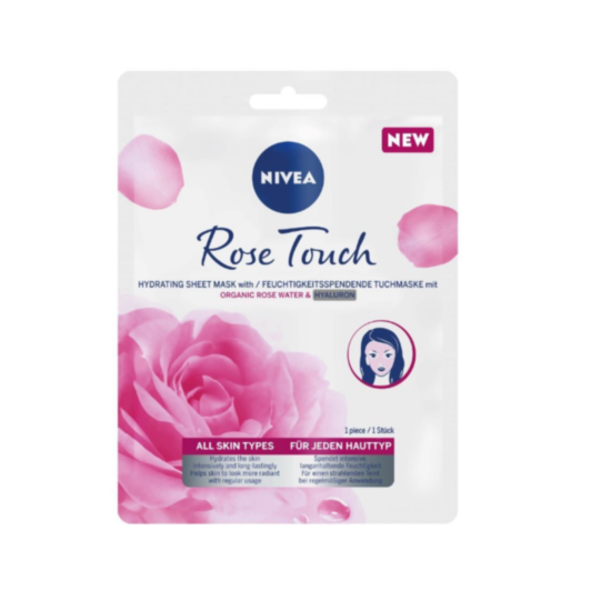 НИВЕА РОУЗ ТЪЧ ХИДРАТИРАЩА ЛИСТ МАСКА е лист маска за лице, която е напоена със серум, който съдържа био розова вода и хиалуронова киселина. Само за 10 минути, формулата интензивно хидратира и освежава кожата. Тя стимулира регенерацията на кожата и се бори с признаците на стареене. Включената хиалуронова киселина има овлажняващи, изглаждащи, тонизиращи и противовъзпалителни свойства. Тя дълбоко хидратира кожата и я прави мека, еластична и гладка. Дерматологично тестван продукт.