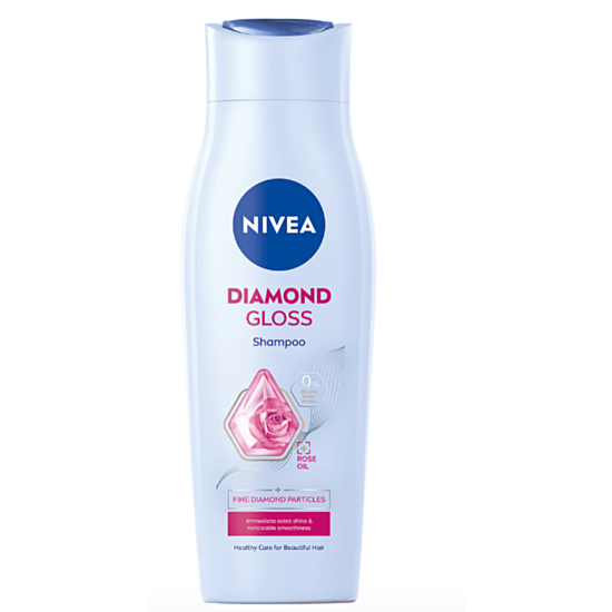 НИВЕА ШАМПОАН ЗА БЛЯСЪК ДАЙМЪНД ГЛОС 250МЛ 81594 е шампоан за коса, който осигурява мекота и диамантен блясък. Специалната формула с модерна технология, отразяваща светлината дарява косата с неотразим блясък. Формулата съдържа диамантени частици и Nutri-Essences – ценна комбинация от масло от макадамия и Eucerit®, които подсилват косата, заздравяват всеки кичур и придават ослепителен блясък. Предназначен за нормална до суха коса. След употребата му косата ви ще бъде мека, красива и бляскава. Дерматологично тестван продукт.