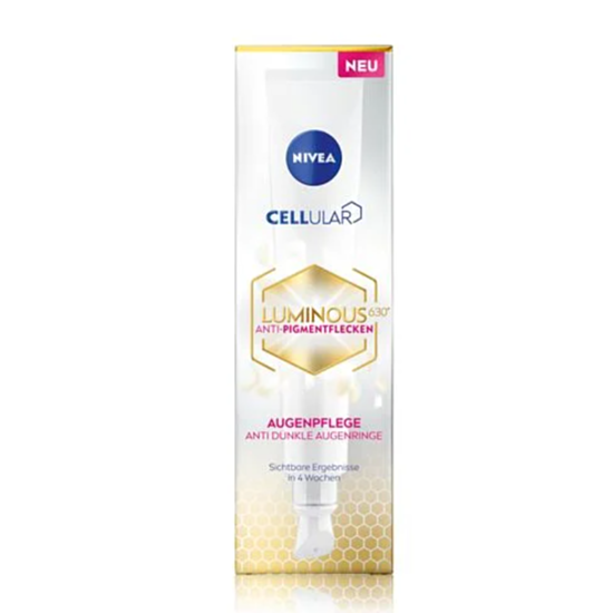 НИВЕА ЦЕЛУЛАР ЛУМИНОС ОКОЛООЧЕН КРЕМ 15МЛ - Околоочният крем-серум с патентована формулата с Luminous 630® ефективно третира 3 - те основни причини за поява на тъмни кръгове под очите. Комбинацията му от съставки действа на клетъчно ниво: LUMINOUS630® балансира нарушенията в пигментацията; eнергизиращ кофеин намалява умората, подпухванията и торбичките; хиалуронова киселина хидратира и редуцира фините линии и бръчки. Видимо намалява тъмните кръгове под очите. Ефективен върху всеки тон на кожата. Дерматологично одобрен. Деликатен към кожата и подходящ за всеки тип кожа, включително чувствителна.