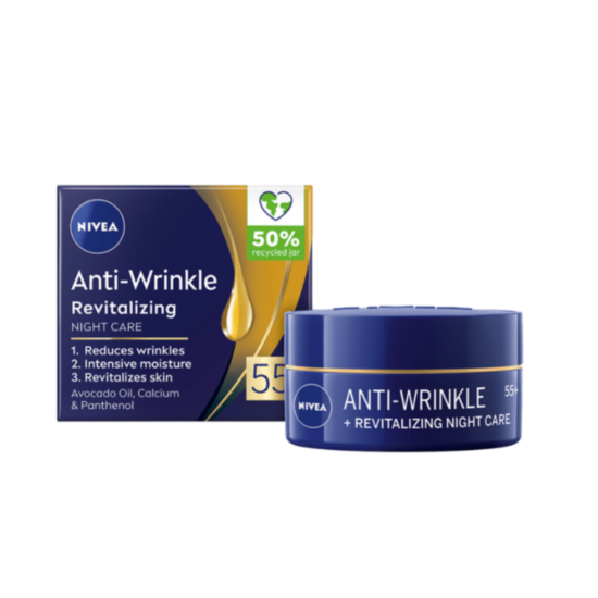 НИВЕА ВЪЗСТАНОВЯВАЩ НОЩЕН КРЕМ ПРОТИВ БРЪЧКИ 55+ 50МЛ 81282 е регенериращ нощен крем против бръчки 55+, предназначен специално за зряла кожа, с тенденция да губи жизненост и регенеративна способност. Специалната формула е обогатена с подхранващи съставки като масло от авокадо, калций и пантенол. Докато маслото от авокадо представлява защитна бариера за кожата, увредена от влиянието на времето, калцият и пантенола стимулират процеса на регенерация на клетките през нощта. Нивеа Анти-Ринкъл Плюс Регенериращ нощен крем против бръчки 55+ видимо редуцира фините линии и намалява дълбочината на бръчките. При редовна употреба на крема, кожата придобива жизненост, мекота и сияен вид. Дерматологично тестван продукт.